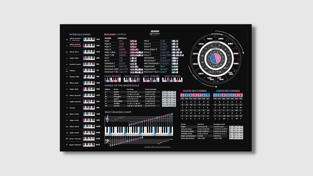 The poster includes a chord building table with all of the most commonly used chord symbols + keyboard visualization, a simplified circle of fifths diagram, an interval chart, major and minor key scale degree tables for building chord progressions, a handy inversions chart, a sight reading diagram to help you learn to read sheet music, a chart of the modes of the Major Scale, and the most widely used scale structures.